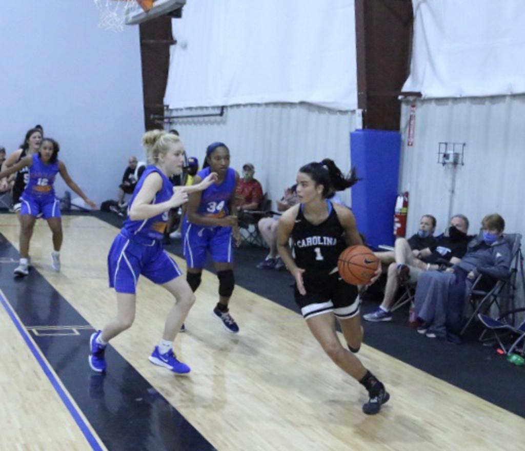 Aliyah Corpening (2023) is another one of Team Carolina’s main ball handlers who moves fluidly with the ball and knows where to go to find the openings in the defense. She drives in the lane well herself, or she finds her open teammate to make the best play. She also moves well without the ball helping run the floor or set herself up for her own jump shot.